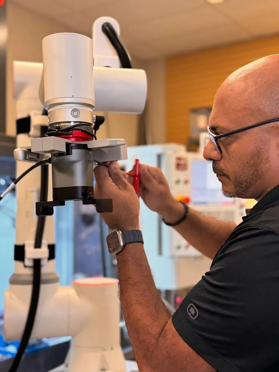 A trained robotic arm connects to your CNC machine with no wiring and minimal setup., Control and monitor production through a simple dashboard backed by real engineers, on-site and remote.